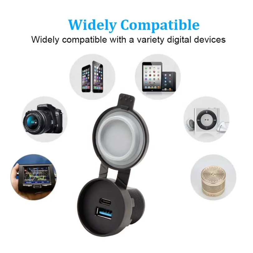 Cargador rápido Toma USB-C (de 20W) + QC3.0. Impermeable IP67 para embutir en Moto, Auto, náutica o MotorHome.